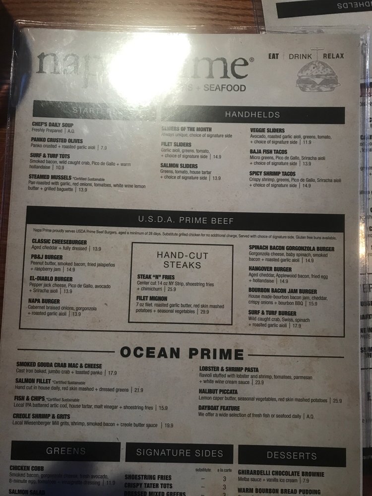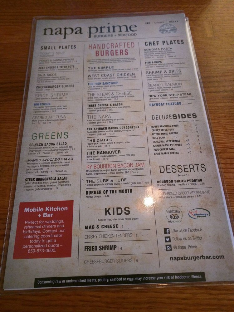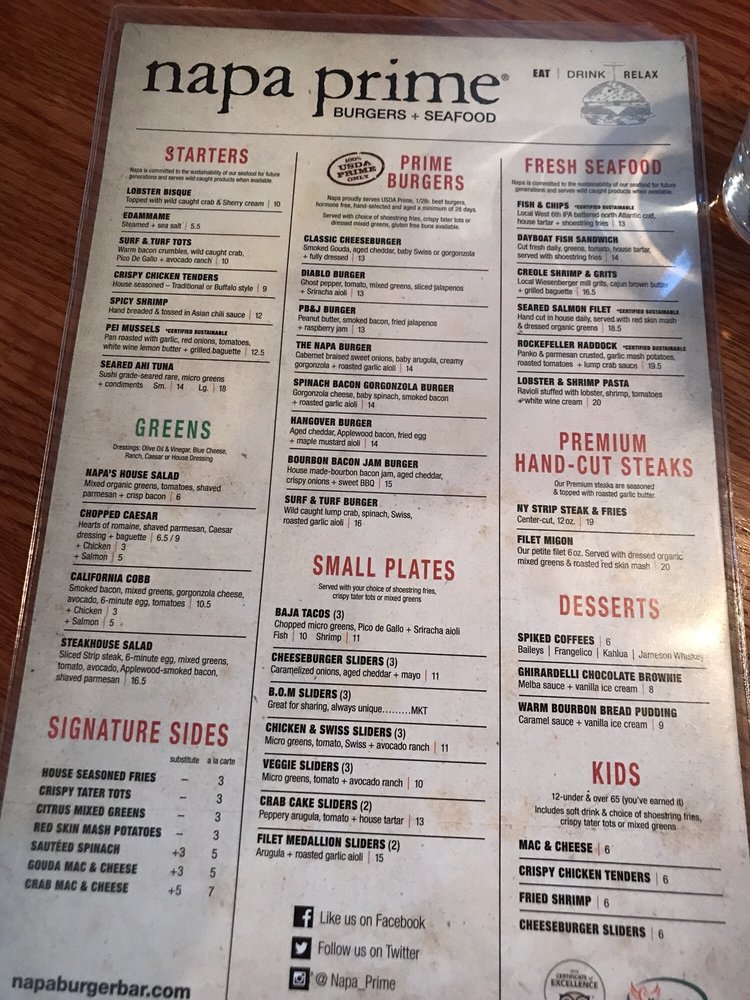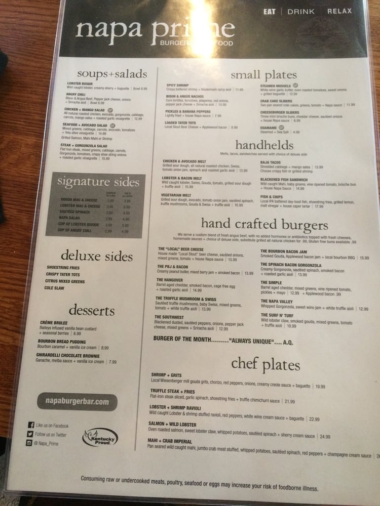 Napa Prime Burgers + Seafood offers a diverse menu with starters like Crispy Olives and Ahi Tuna Sashimi. Handheld options range from Baja Fish Tacos to Lobster Quesadilla. Their U.S.D.A. Prime Burgers include unique creations like the PB and J Burger and the Hangover Burger. Reviews highlight the quality of the food, with mentions of the Elk sliders and the Ky Bourbon Bacon Jam Burger standing out. The atmosphere, while quirky in a former Pizza Hut location, receives mixed reviews. The attentive service and fresh seafood options are praised, making this a must-try spot for burger and seafood enthusiasts. The creativity in their menu and the attention to detail in their dishes make Napa Prime Burgers + Seafood a standout dining experience.